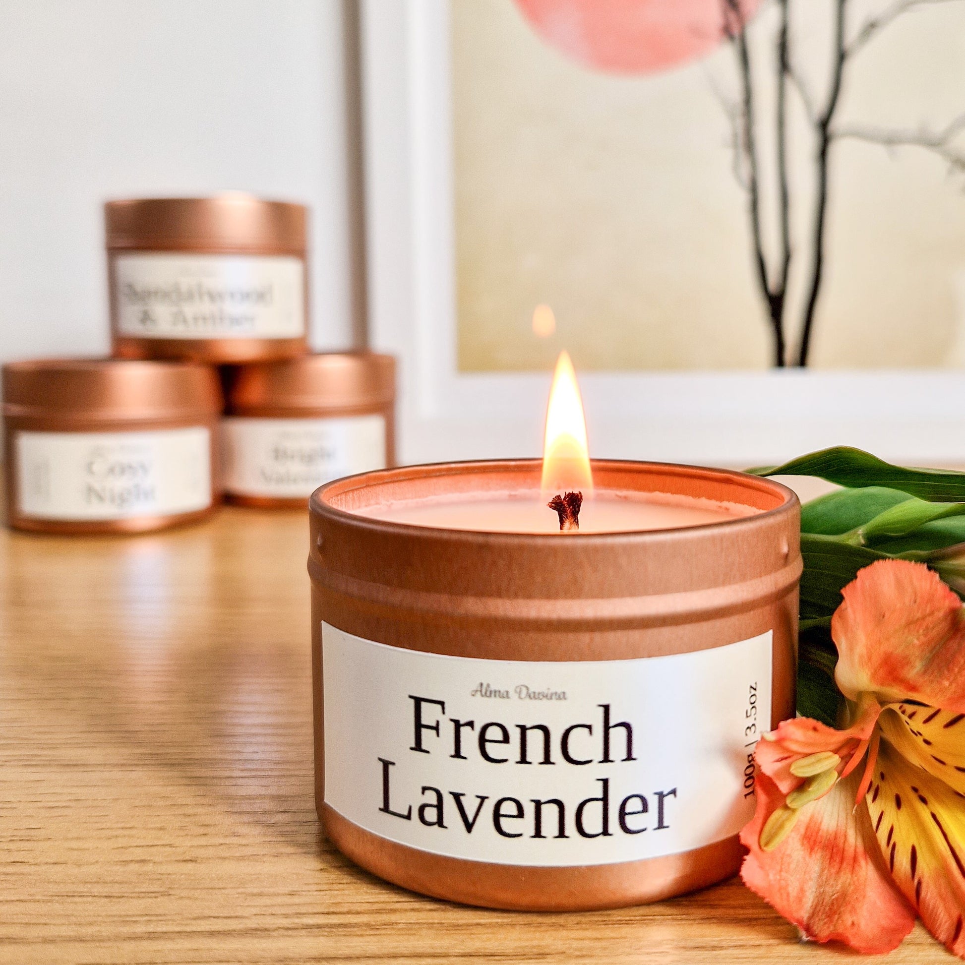 The details: 100g (burns for 20 - 25 hours), soy wax, pure essential oils, rose gold tin, cotton wick, recyclable paper labels, vegan, cruelty-free, recyclable, reusable tin